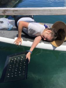 In order to stress them out as little as possible, we have to work quick and make sure the water is not too warm. To minimize the time process, we used a paddle board to sit on while keeping the corals in the water. To keep the corals under, we had to ziptie the tray of corals to the underside of a life saver.