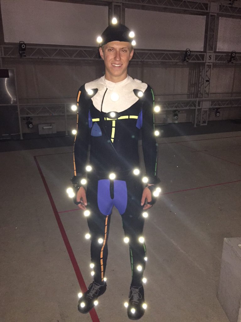 Now Friday was the most exciting day so far, when I got the chance to suit up in a full MoCap suit and capture data to be used for test footage in a bid for upcoming work. After suiting up and going through some rehearsals, I completed a set of ROM’s (Range of Motion), then we were ready to capture. We worked for about 45 minutes and it was a blast. You can see me in the suit below. You night notice that I did not have a full helmet camera on, meaning that were not to capturing facial data, just body data.