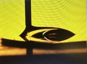 This is the stamped part of the gold. The Octadecanethiol (ODT) acted as a wet-etch protection making the gold in this area stay hydrophobic. The contact angles for this droplet are 100.1 degrees for the left side and 97.0 degrees for the right side.