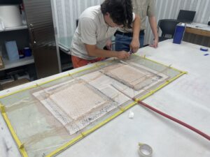 On another note, during our mornings at Excelsior, we had the honor of participating and helping with the casting of a glass weave composite. This composite, a series of glass fabric stacked on top of one another with a foam core, is to be used the following week for compression tests.