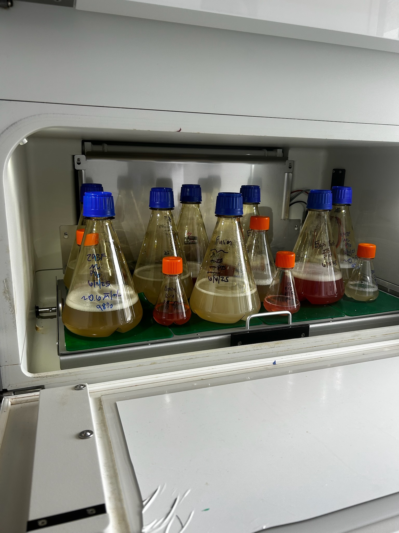 This whole process can be done to different degrees from giga to turbo in order to develop the desired amount of DNA. Liendo allowed us to shadow and partially assist in a Gigaprep, the largest done in the lab and the next day Azari and I performed multiple Maxipreps ourselves under the supervision and guidance of Nate B. Now the DNA will be ready for transfection into Expi 293 host cells on Monday. We’ll eventually be expected to do this entirely on our own. It’s important to maintain sterile technique throughout your work in order to avoid cross contamination which did unfortunately occur with a DNA sequence for a heavy set chain of proteins we were attempting to develop. The sample was ruined as I forgot to check that the labels for the vial and flask of DNA solution matched. Luckily our mentors are very accepting of mistakes as they’ve all made much worse ones throughout the scope of their careers. The DNA can be regrown and a successful scientist learns from mistakes and moves on.