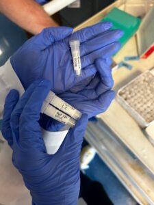 Having been drilled in the processes of the central dogma, we selected antibodies of our own to cultivate this week. I chose PGT121: a monoclonal broadly neutralizing antibody that has shown significant potential for effectiveness against HIV. Azari chose a Malaria antibody called 311. We retrieved the glycerol stock of the plasmids engineered for these antibodies, as they’ve been grown in the lab before, and left them in incubators and bacteria media to grow. Azari and I each started with four samples; two sets of heavy and light chains, one set resistant against carbonate antibiotics and the other resistant against kanamycin. Both my chains grew in carb but not in kan, Azari’s heavy chain only grew in carb and her light chain only in kan. We then ran through the lysis and purification process, the amount we grew constituted a miniprep. At the end I had 581.7ng/ml heavy chain and 982.9ng/ml light chain which is pretty good! Both my counts were higher than Azari’s (brag). Both our cells were in acceptable range for transfection so we made 30ml each. 6.9ug of the HC (13.3 ul) and 17.1ug of the light chain (17.4ul) are mixed with 3 ml of optimem and 24ul fectopro which is a similar reagent to 40k PEI. Let that sit and incubate for 10 or so minutes then mix with your 30ml of host cells and move to the incubator. Now these cells will begin creating PGT121 antibodies. Everyday since we’ve been spinning down our transfected cells and taking a sample of the antibody supernatant. If we continue to do this over the next week or so we can track how effective our cells have been at producing the PGT121 and 311 respectively. We even got our own sample boxes to store each days tube.