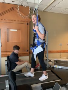 Another thing that I had been wanting to try was the stepping harness and treadmill. A few weeks ago, I mentioned a session where one of the participants would use a body weight support system and harness to help them be able to stand with good form. This week, I got to get up in the harness and see what it feels like to try and walk and run with body weight support. All I can say is that it was pretty strange to try and run with a harness holding up 50% of my body weight. I felt like I was floating and my running definitely looked a lot more awkward than usual.