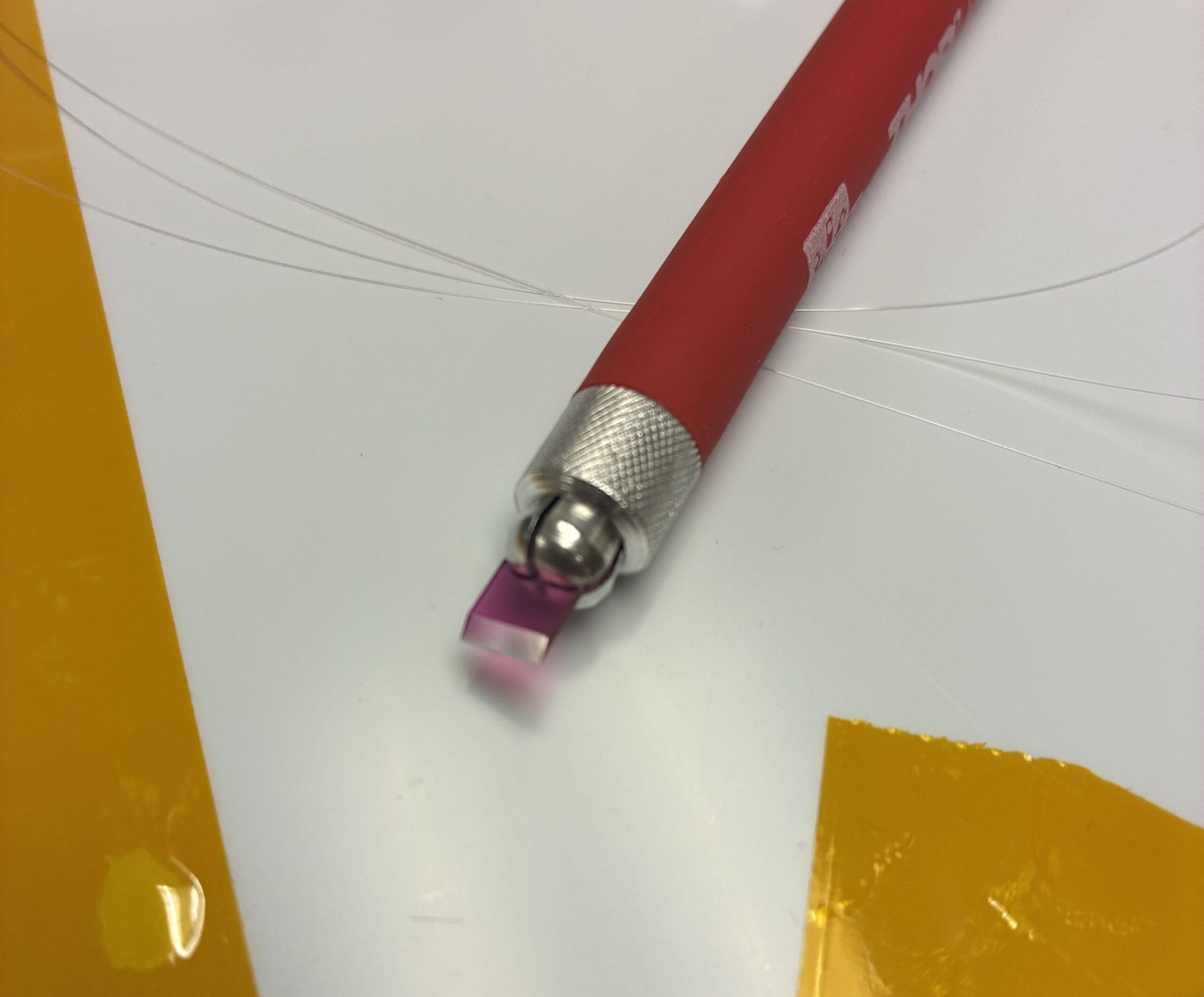 We started each run by carefully cleaving the fibers with a precision ruby cleaving knife(image below)—an exacting process that requires a steady hand to get a clean break and avoid damaging the fiber endfaces. Once we had perfectly cleaved ends (image attached), we aligned the UV fiber between the deuterium lamp and the entrance slit of the monochromator. It was satisfying to see that alignment beam hit the core of the fiber just right, ensuring maximum coupling of UV light. After sealing everything up, we pumped down the vacuum chamber to about 3 × 10⁻⁶ torr, monitoring the pressure gauge until it stabilized. Then, with the system under this “high vacuum”, we executed a series of spectral scans where we step the monochromator through UV wavelengths and recording transmitted intensity. In the next weeks I’m excited to vary other parameters—like bend radius and fiber type, to see how they influence our transmission curves.
