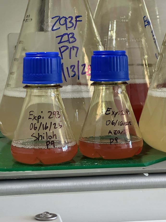 Once the DNA is extracted and purified (see Week 1) we can ‘transfect’ the plasmids into Expi 293 host cells which are selected for their high product output. Said cells do not come ready made. Starting on Monday, Nate B. delegated two 50 ml flasks of Expi 293 cells to Azari and I to cultivate. For the past week we’ve split, counted, and grown our cells basically on our own. We’ve gotten pretty attached to them; they have assigned names and genders, we celebrated their tenth birthday when we split them into their 10th passage on Wednesday much to the amusement of our lab mentors. Birthday cards were written (by us) and a birthday candle was searched for in the breakroom (by Liendo). We treat them like our literal children and I’m pretty sure our housemates are thoroughly tired of Azari and I singing praises of our care for them at the dinner table each night. Cell count for incubated Expi 293 theoretically doubles every day and at his first split my cell culture, Bellamy, was undergrown. It’s important to swirl suspended cells like Expi 293 before taking a cell count to ensure you don’t end up with an inaccurate count and underfeed your cells. Even if his cell count had reached 1.5×10^6 cells/ml Bellamy still would have had less than a hundredth of a percent of the cells needed to make a human fetus, which is crazy! Luckily, addition of extra media at his split allowed him to grow to 2.71×10^6 cells/ml with 99% viability by Friday; which made him perfect for transfection.