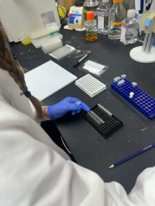 Sean was back in the lab this week and was happy to teach us about Gibson Assembly: a DNA assembly method that joins together DNA fragments (the insert and the vector) to create a singular plasmid. We use these engineered plasmids to create antibodies we can test for effectiveness against viruses like HIV. Restriction enzymes splice the antibody gene from an already existing plasmid and what is left of the DNA ring is the vector; it’s what will carry the antibody gene and allow it to express itself. The insert is the antibody we want our plasmid to eventually express; it can be fitted into the opening left by the spliced sequence. An enzyme called exonuclease ‘chews’ the ends of both the vector and the insert to make them partially single-stranded and sticky. The two ends will then be slotted together like puzzle pieces by the primer and bound by polymerase. A primer is a short strand of DNA fitted to match each paired end of the vector and insert and acts as a temporary joiner and landing pad for the polymerase which will permanently anneal the fragments together. DNA Ligase will seal any nicks in the sugar-phosphate backbone (the sugars of the nucleotides (A, T, C, G) joined and stretched across the strand of DNA). When bases are paired in Gibson Assembly, the backbone is not covalently sealed. Luckily, ligase can fill the gaps to ensure DNA stability and plasmid function. When we do Gibson assembly in the lab these joining enzymes come commercially pre-mixed for us in a solution officially labeled as ‘HiFi DNA Assembly Master Mix’ which is super duper convenient. It means we can just combine 2 microliters of our antibody gene fragment (the insert) with 1 microliter backbone (the vector) and 3 microliters of Master Mix, then pop it in incubator at 50 degrees celsius for an hour and bam! We’ve got recombinant plasmids ready to go for transformation.
