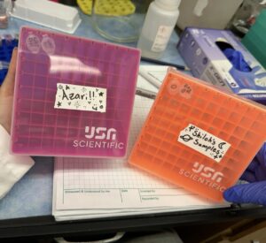 Monday was very laid back. It was cell-splitting day so I calculated and split my cells on my own. Over the past few splits, I’ve grown very confident in my ability to do it independently so this only took about 10 minutes. Sean showed us the transfections from last week and unfortunately ours didn’t have much growth. I’m not too surprised because it is a very meticulous procedure and things could go wrong at any step. Sean’s transfection was successful and ready to be purified. He also showed us the BLI (biolayer interferometry) technique. BLI is used to study how a specific molecule (HIV antibody in Sean’s case) interacts with another (antigen). It measures how well an antibody sticks to an antigen. All of my mentors were busy with personal work meaning they didn’t have any work for us. Between meetings, Nate B. took us to Raising Canes which I was so happy about. He’s definitely gone up on my list of favorite people in the lab. Majority of the day Shiloh and I had time to work on personal things. I spent that time doing college prep so it was still a productive day!