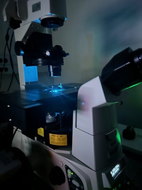 We then performed our own experiment to “cell-paint” a cell; which is a process in which you stain certain aspects of a cell in order to be able to see and identify different parts of the cell (mitochondria, nucleus, ER, etc.) After doing this, we got to image our own cells, as well as have some free rein to really explore the microscope and all it can do, which was super amazing!