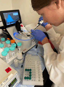 Having been drilled in the processes of the central dogma, we selected antibodies of our own to cultivate this week. I chose PGT121: a monoclonal broadly neutralizing antibody that has shown significant potential for effectiveness against HIV. Azari chose a Malaria antibody called 311. We retrieved the glycerol stock of the plasmids engineered for these antibodies, as they’ve been grown in the lab before, and left them in incubators and bacteria media to grow. Azari and I each started with four samples; two sets of heavy and light chains, one set resistant against carbonate antibiotics and the other resistant against kanamycin. Both my chains grew in carb but not in kan, Azari’s heavy chain only grew in carb and her light chain only in kan. We then ran through the lysis and purification process, the amount we grew constituted a miniprep. At the end I had 581.7ng/ml heavy chain and 982.9ng/ml light chain which is pretty good! Both my counts were higher than Azari’s (brag). Both our cells were in acceptable range for transfection so we made 30ml each. 6.9ug of the HC (13.3 ul) and 17.1ug of the light chain (17.4ul) are mixed with 3 ml of optimem and 24ul fectopro which is a similar reagent to 40k PEI. Let that sit and incubate for 10 or so minutes then mix with your 30ml of host cells and move to the incubator. Now these cells will begin creating PGT121 antibodies. Everyday since we’ve been spinning down our transfected cells and taking a sample of the antibody supernatant. If we continue to do this over the next week or so we can track how effective our cells have been at producing the PGT121 and 311 respectively. We even got our own sample boxes to store each days tube.