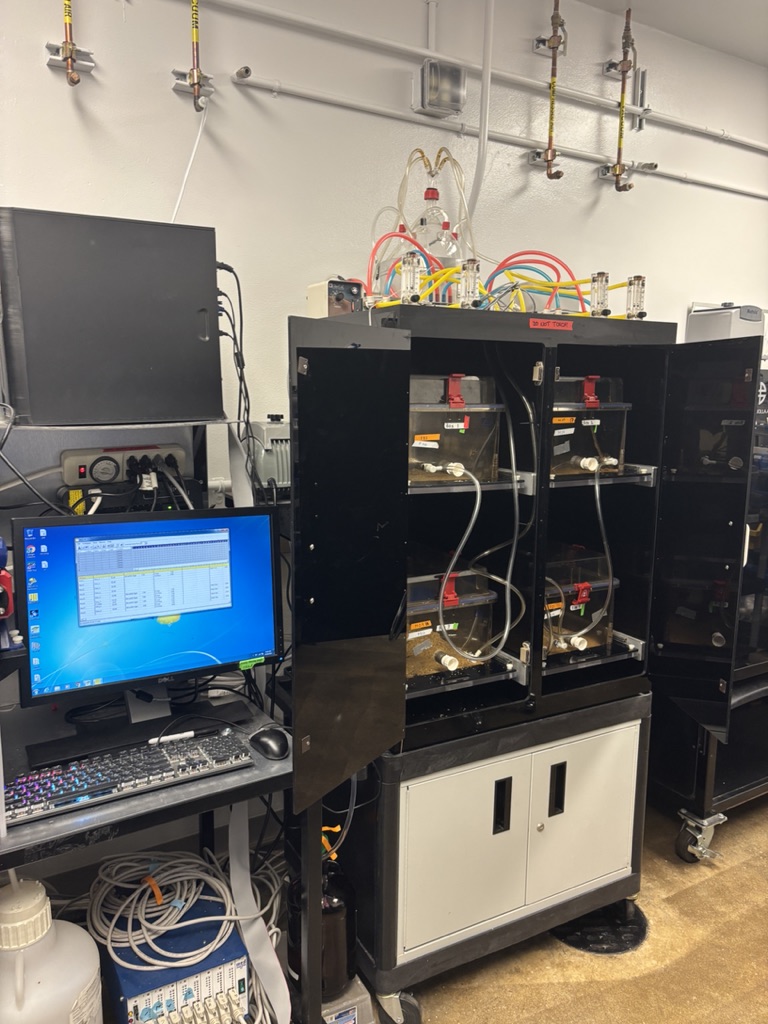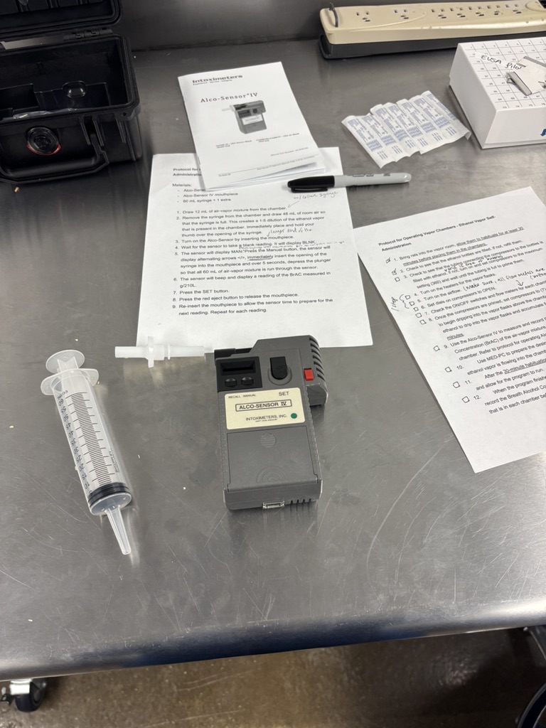 experiments. They told me that they have been testing these chambers honestly since April and haven’t reached their desired level until now. My first week here, I remember Sonja and Max testing out these chambers, and they unfortunately didn’t work yet. Elizabeth worked with multiple people (Olivier, our PI, Giordano, a previous scientist for the George Lab, and Morrie, the person who made the chambers) to fix the problems, and they were able to accomplish it! So today was all about testing the new system to see if everything was working out. Before putting the rats in, we had to test to see if the breathalyzer was working well, and we recorded the amount of ethanol vapor in each chamber. Max wanted to make sure his protocol was going to work, so he handed me the instructions to measure with the breathalyzer, and had me follow