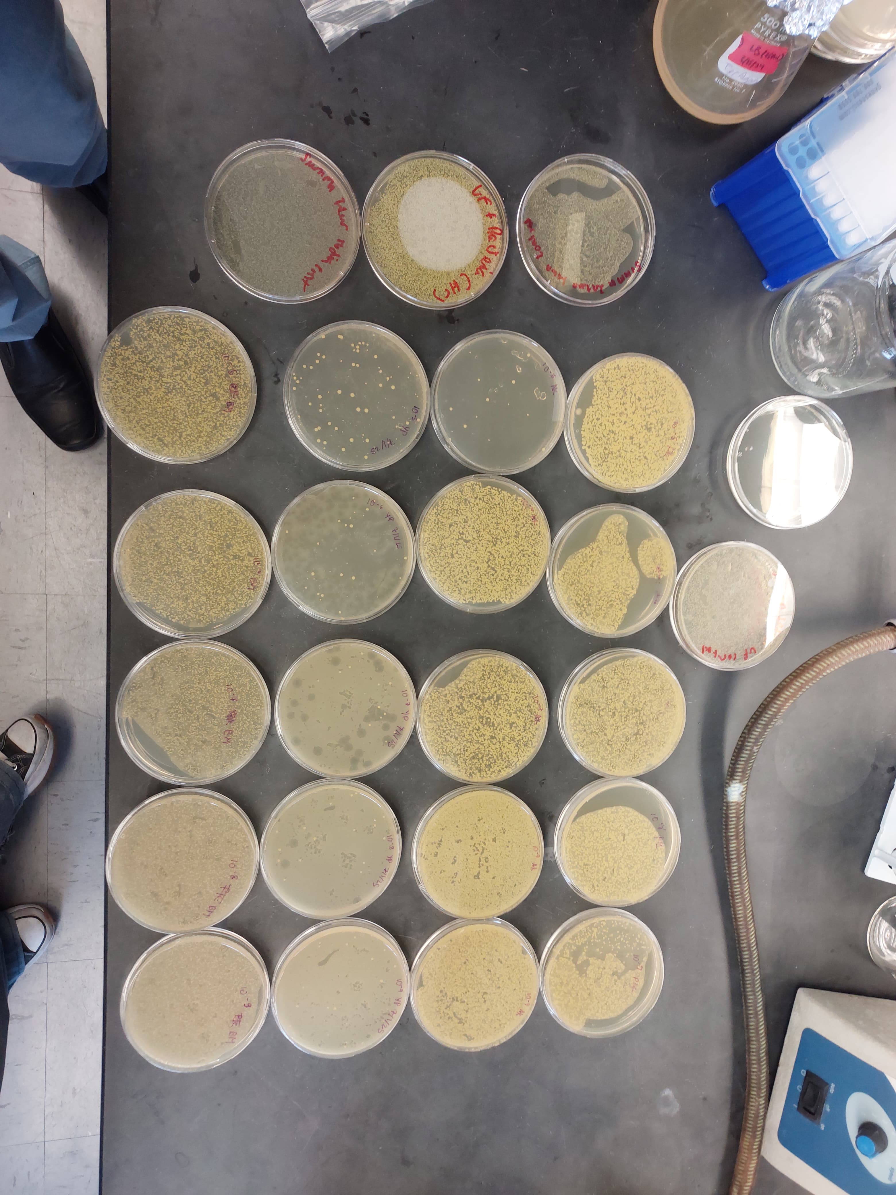 All jokes aside this week the plates once again did not plaque, but this time it was the other interns plates. Bala and I were tasked with walking the newer interns through the entire phage isolation process for practice. On Tuesday we checked the plates and they looked like this…