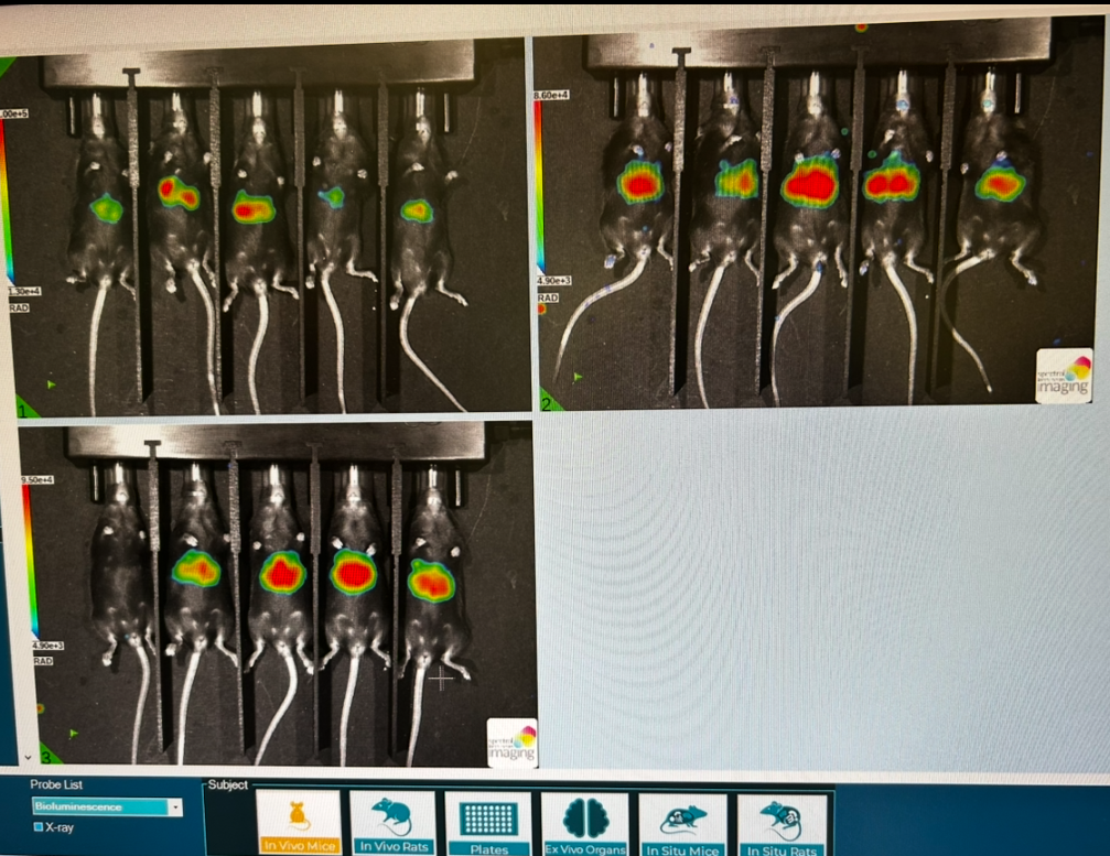 Azari tried to perform one of the retro-orbital administrations on a mouse from group 2 and almost succeeded but couldn’t quite keep the syringe positioned within the sinus throughout delivery. The mouse bled profusely from the eye for a second which freaked us both out since it’s possible to pierce too deep into the membrane there and enter the brain cavity (potentially killing the mouse) but ultimately after a little TLC, the little girl was fine. I thought she did pretty good for a first timer. Because we challenged on Friday, we spent Sunday morning in the lab imaging and analyzing. Azari and I each performed intraperitoneal injections (body cavity) on a cohort of the mice with 100 ul D-luciferin each in order to measure luminescence. The mice are injected with 50 ul on either side of their stomach and then placed in a AMIHTX in vivo imager. The greater the ‘glow’ that’s measured the more infected the mice are but I don’t think we waited long enough between antibody administration and challenging to get truly accurate results. Our 311 antibody should have neutralized the plasmodium yet our imaging showed a live infection. Given that infecting these mice with plasmodium would eventually lead to a prolonged and inhumane death we had to euthanize them after this procedure via cervical dislocation and CO2 exposure. This is all done super humanely, the mice remain under anesthesia for cervical dislocation.
